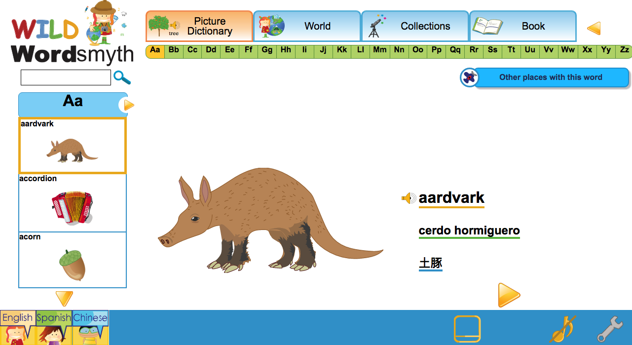 The Picture Dictionary defines words by picture only, but child-friendly definitions, example sentences, and additional images can be easily accessed through the word’s link with its dictionary entry in the Book. From there the child can navigate to that word anywhere else where the word appears in WILD. The aardvark, for example, can be found with other animals in the Mammals collection. The accordion can be seen in the school’s Music Room in the WILD World as well as in the Musical Instruments collection. The acorn can be found in the Trees and Tree Parts collection. By navigating to different parts of WILD, children can learn not just what a single word means as an individual item but how that word relates to other things in the actual world. This is how WILD integrates the learning of word meaning with the acquisition of real-world knowledge—in a way that is really fascinating and fun for kids!