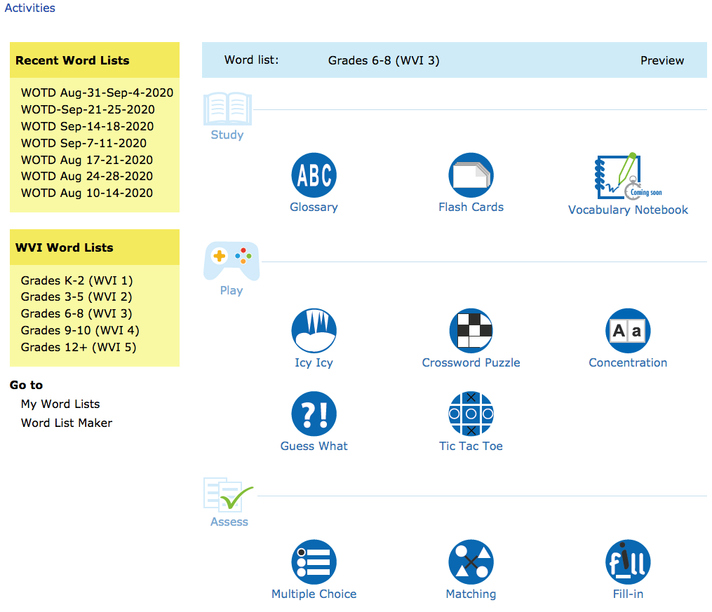 On the Activities page of the Vocabulary Center, you can pick a word list from the yellow sidebar. If you haven’t created any lists of your own yet, you can always choose one from the Wordsmyth Vocabulary Inventory (WVI) lists according to your grade level. These are leveled and curated academic vocabulary lists. After you’ve selected your list, its name will appear in the blue banner above the activities.