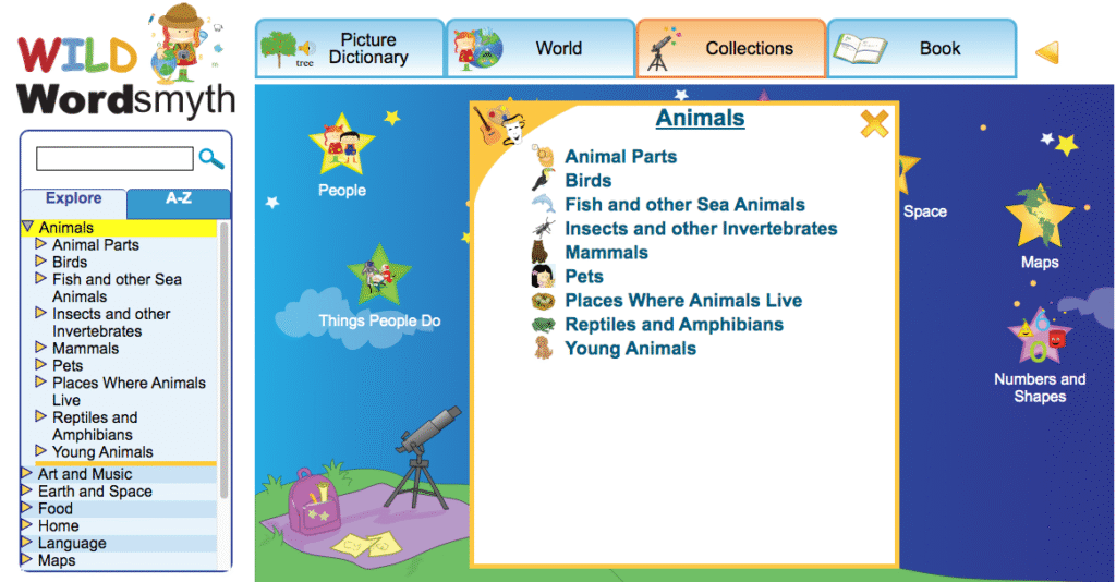 Collections navigation within the main display: When a child (or teacher) mouses over a category in the “stargazer” visual menu—the top level for Collections in the main display—it will simply highlight the image in yellow. Clicking on the image will open the menu of collections for that category in the center of the screen. Making a selection from the menu brings up the selected collection. When opened, the name of the collection (e.g., “Insects and Other Invertebrates,” “Reptiles and Amphibians”) will appear in the blue banner at the top of the display, and Book entry icons next to the collection name will let the child look up the meaning of any unknown words contained in that name in the Book.