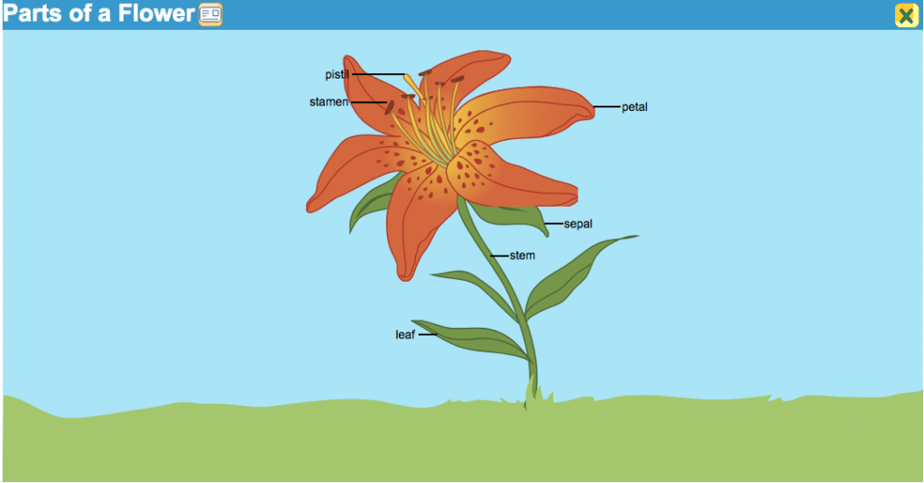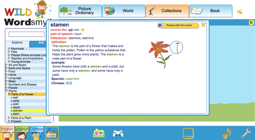 While most collections use the strip format, certain collections are displayed in diagram fashion with one large illustration marked with individual labels. For example, the “Parts of a Flower” collection shows the plant parts labeled on a single illustration of a flower. Mousing over a labeled plant part will highlight it and give access to audio pronunciation for its name as well as defining information in the Book.