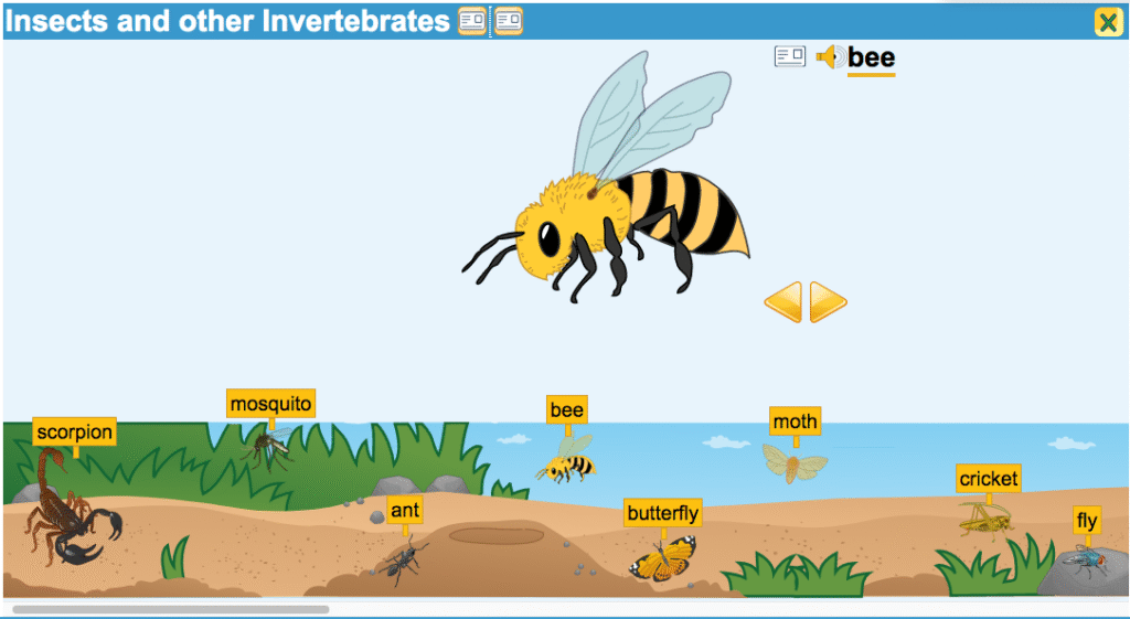 Collections are typically displayed as a set of images in a strip which the child can scroll through. Each image in the strip can be clicked on to pop up a larger image of the item. Once an image is popped-up, its audio icon and Book entry icon will appear, giving access to the word’s audio pronunciation and its defining information in the Book. From the popped-up image, the child can also choose to use the navigational arrows to see other popped-up images from the collection instead of scrolling through the strip.