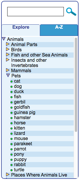 Using the sidebar in Collections: The Collections component is made up of twelve top categories and numerous individual “collections” under each category. The screenshot here shows the top category “Animals,” for example, with its numerous collections, such as “Birds,” “Pets,” “Young Animals,” and “Mammals.” Clicking on a top category label in the sidebar will display there the names of collections that can be accessed under that category. It will also open a visual/textual menu of these collections in the main display, as in the screenshot above. Clicking on the name of a collection in either place will open the collection so that its individual items can be viewed—“ostrich,” “parrot,” “toucan” in the Birds collection, for example. In the sidebar, individual items that make up a collection will appear in a bulleted list under the collection name.