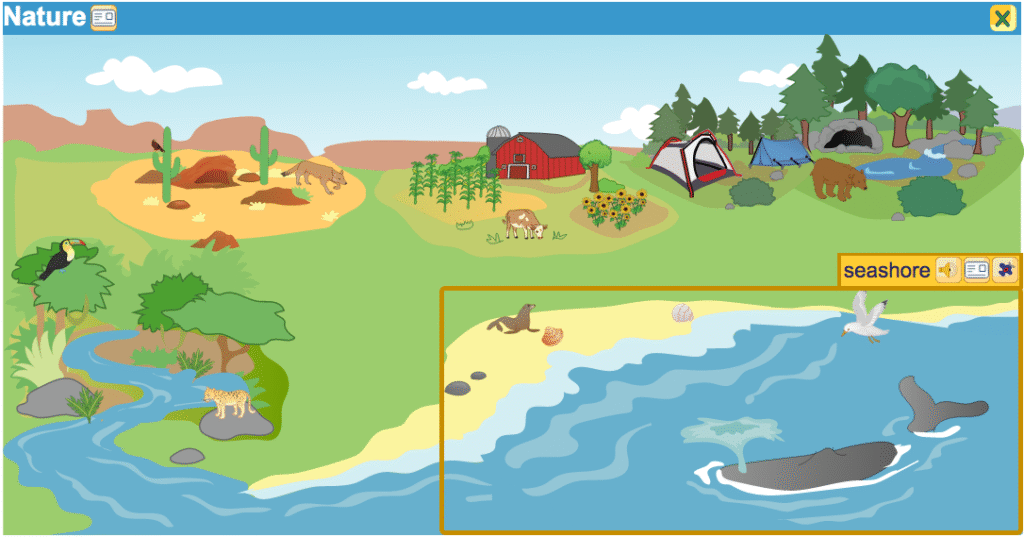 When mousing over images in a setting, the child will find that some highlighted images have airplane icons and others do not. The airplane indicates that the image represents not only a word but a setting—the Tidepool, for example, in the Seashore setting. The child can enter the setting by clicking on the airplane icon or by clicking within the highlighting box surrounding the image.
