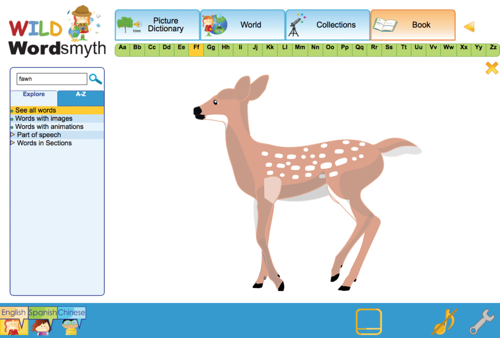 It may be useful to note that the largest images for any item in WILD are found in the Book Page environment. So, for example, there is an illustration for “fawn” in the Young Animals collection and in the expanded dictionary entry, but the “fawn” illustration is at its largest size when you click on the image in the Book Page environment. The many photographs included in WILD are also at their largest size in this environment.