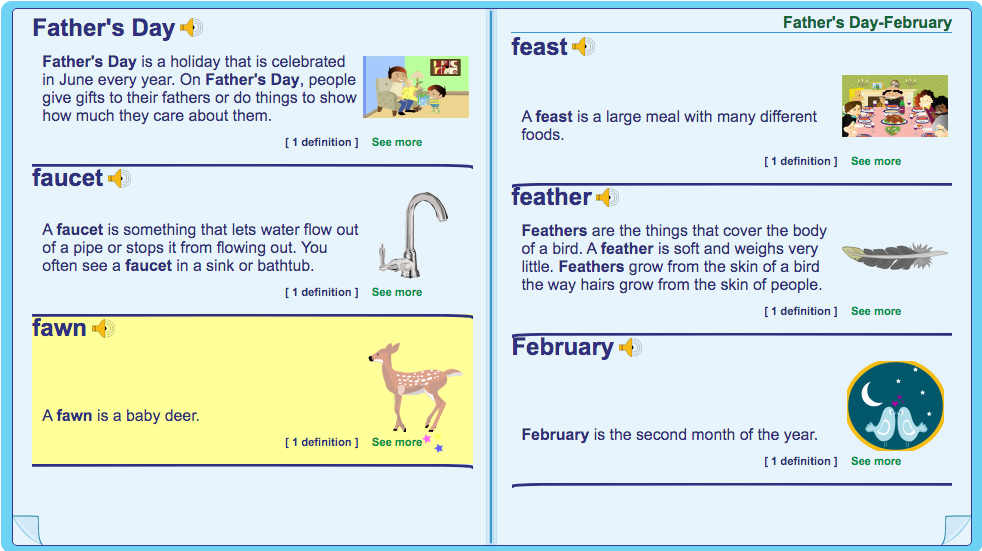 “The Book Page” in the “Places with this word” menu refers to the top level of the Book, which has the appearance of an open dictionary. The “pages” of the Book display images and concise dictionary entries. (They do not offer multiple meanings of words, example sentences, pronunciation, or grammatical information.) Navigating in the Book is done by turning the “pages” or using the search box at the top of the sidebar. Clicking on the “See more” instruction for a word opens the item’s full expanded entry.
