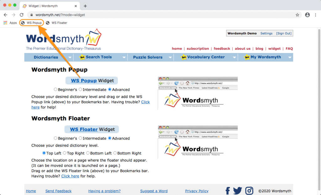 Wordsmyth’s own vocabulary widget, available from its website, allows you or your students to look up words on any web page with any browser. If you are using ReadWorks, your students can use the Wordsmyth widget to look up words other than the ReadWorks pre-selected ones. (You can even compose or paste a text of your own in Google docs and have your students use it with our widget.) Simply drag and drop our widget icon to your browser toolbar from our widget page. Then click on words you want to look up while reading. It’s easy, and it’s free!