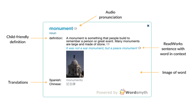 Learn more about the ReadWorks vocabulary widget powered by Wordsmyth on the ReadWorks help page.