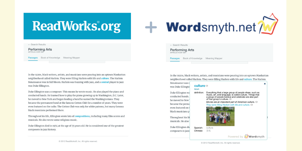 Working in partnership with the acclaimed ReadWorks reading program, Wordsmyth is powering the new “ReadWorks Vocabulary Widget,” now live at www.readworks.org.