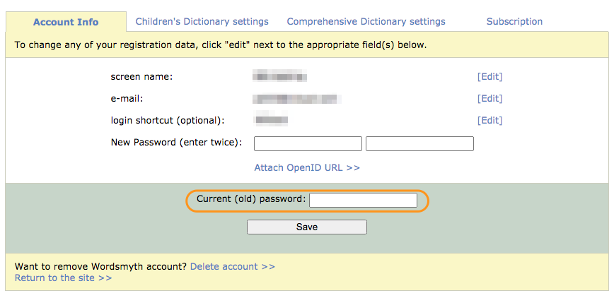 At that point, your password is the one Wordsmyth assigned to you. We recommend you to change it right away to a secure password of your own.