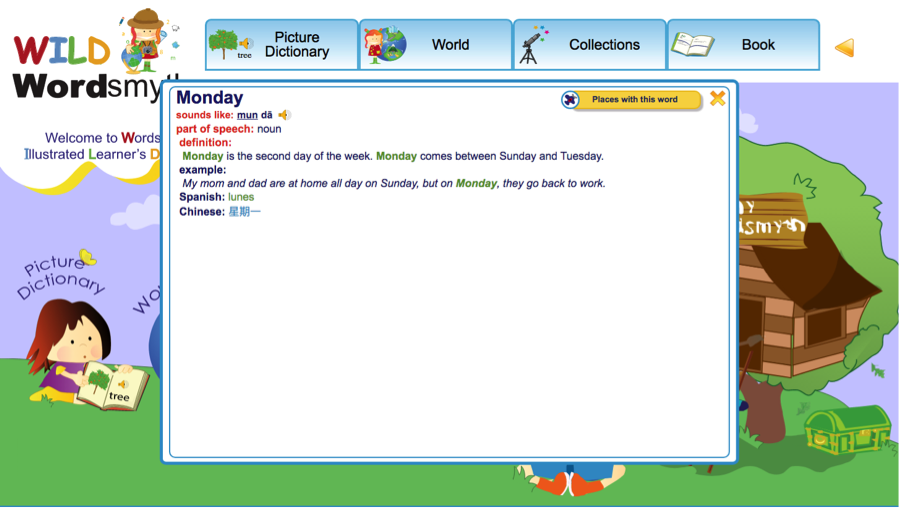 To help young learners whose native language is Spanish or Chinese, WILD allows some level of lookup by Spanish or Chinese directly in the lookup box.