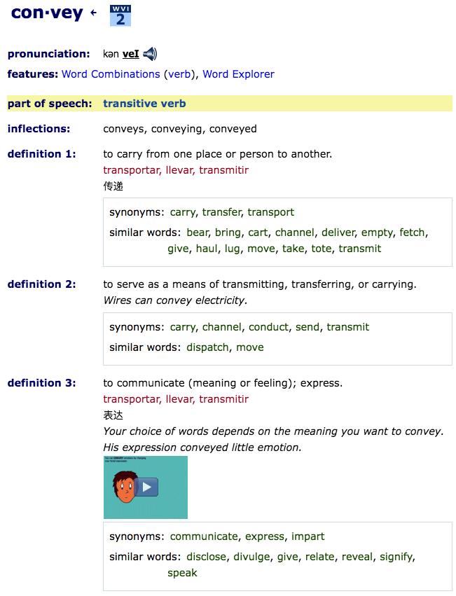 • Definitions and Examples: A definition is a short explanation of what a word means. Each word may have several meanings, also called “senses,” depending on how the word is used. The example sentence or phrase below the definition shows a typical usage of the word. Examples consist mostly of full sentences and demonstrate both the meaning and the grammatical context that the word is typically found in. Examples are always in italic type.